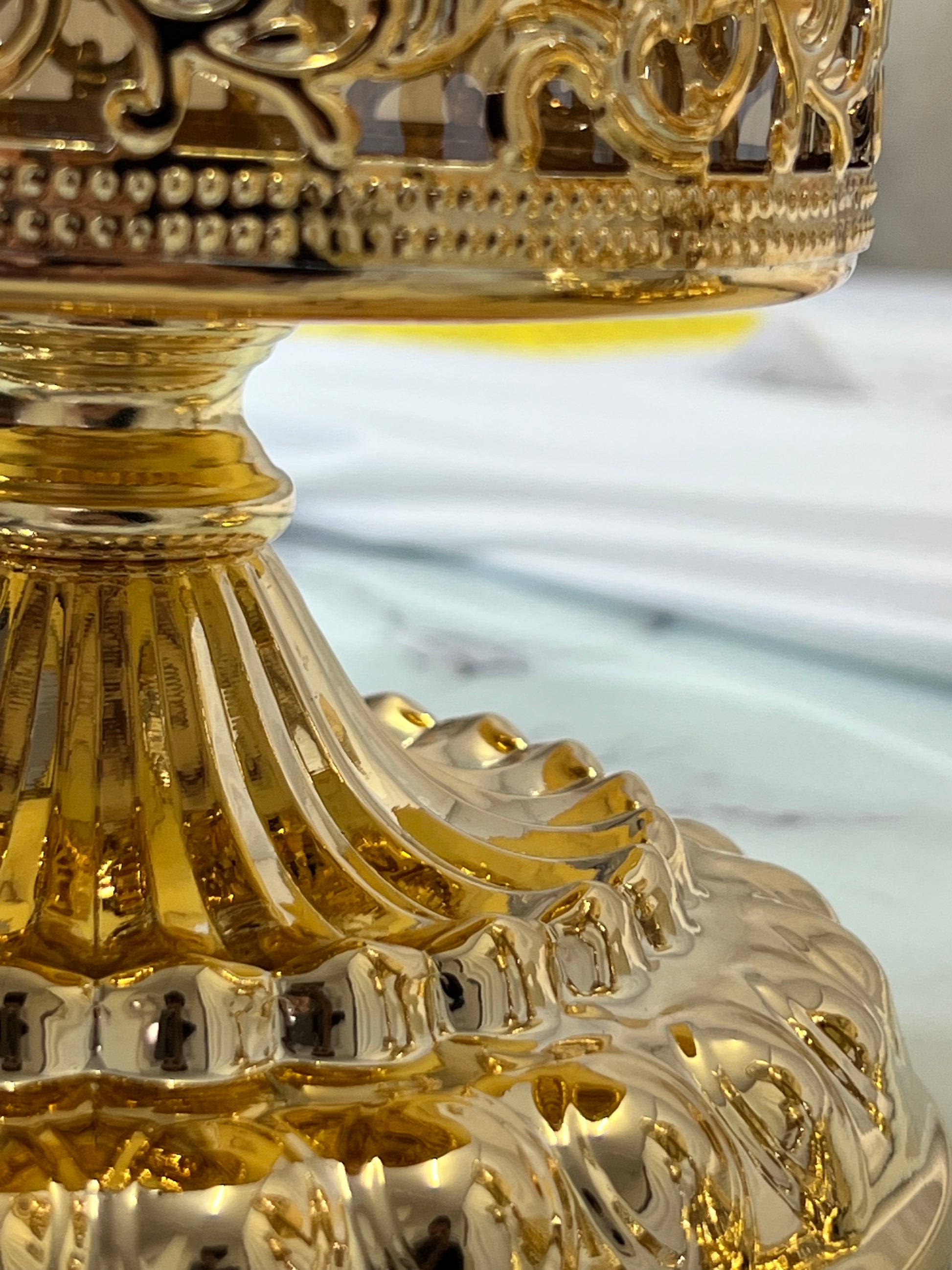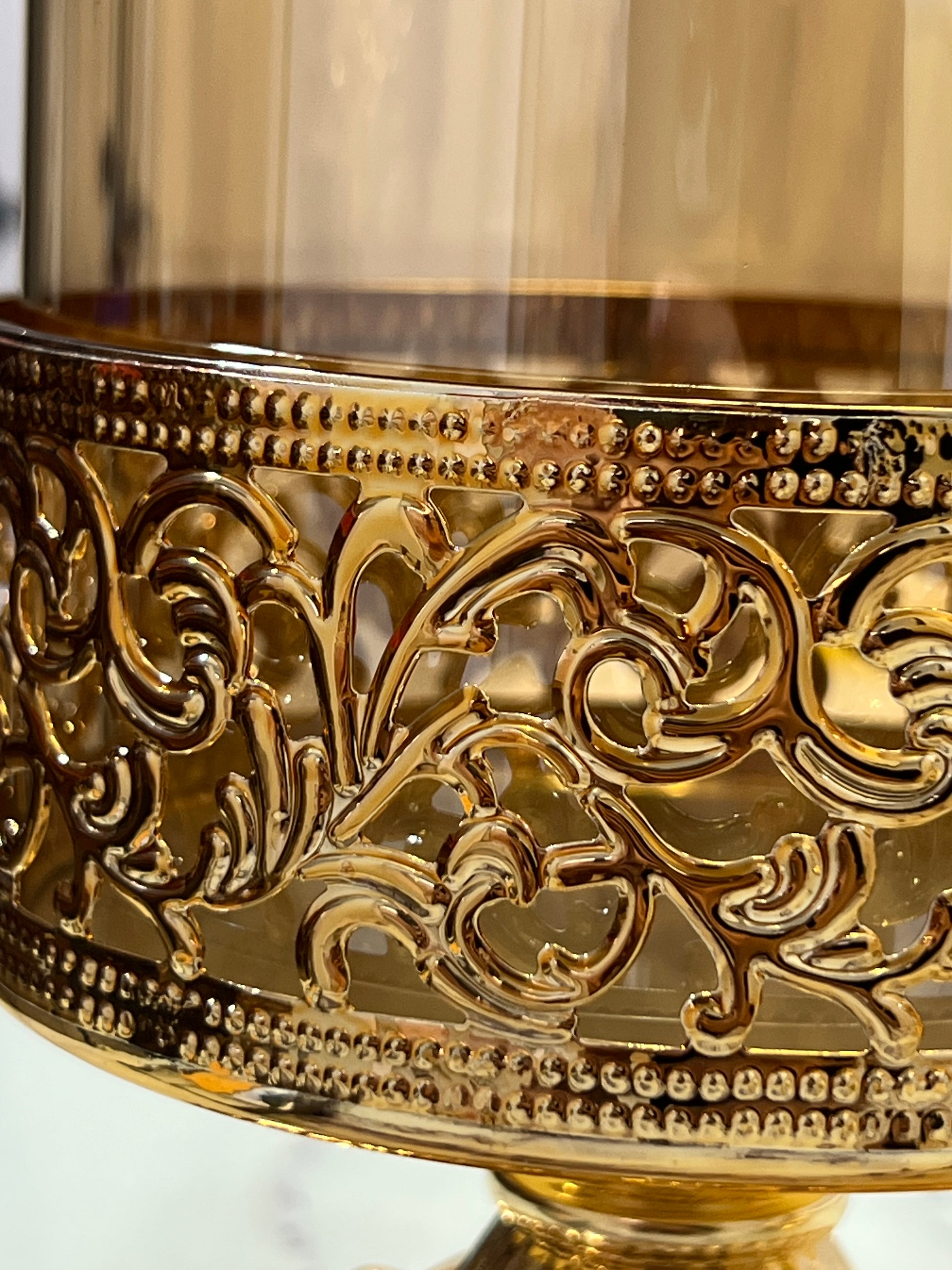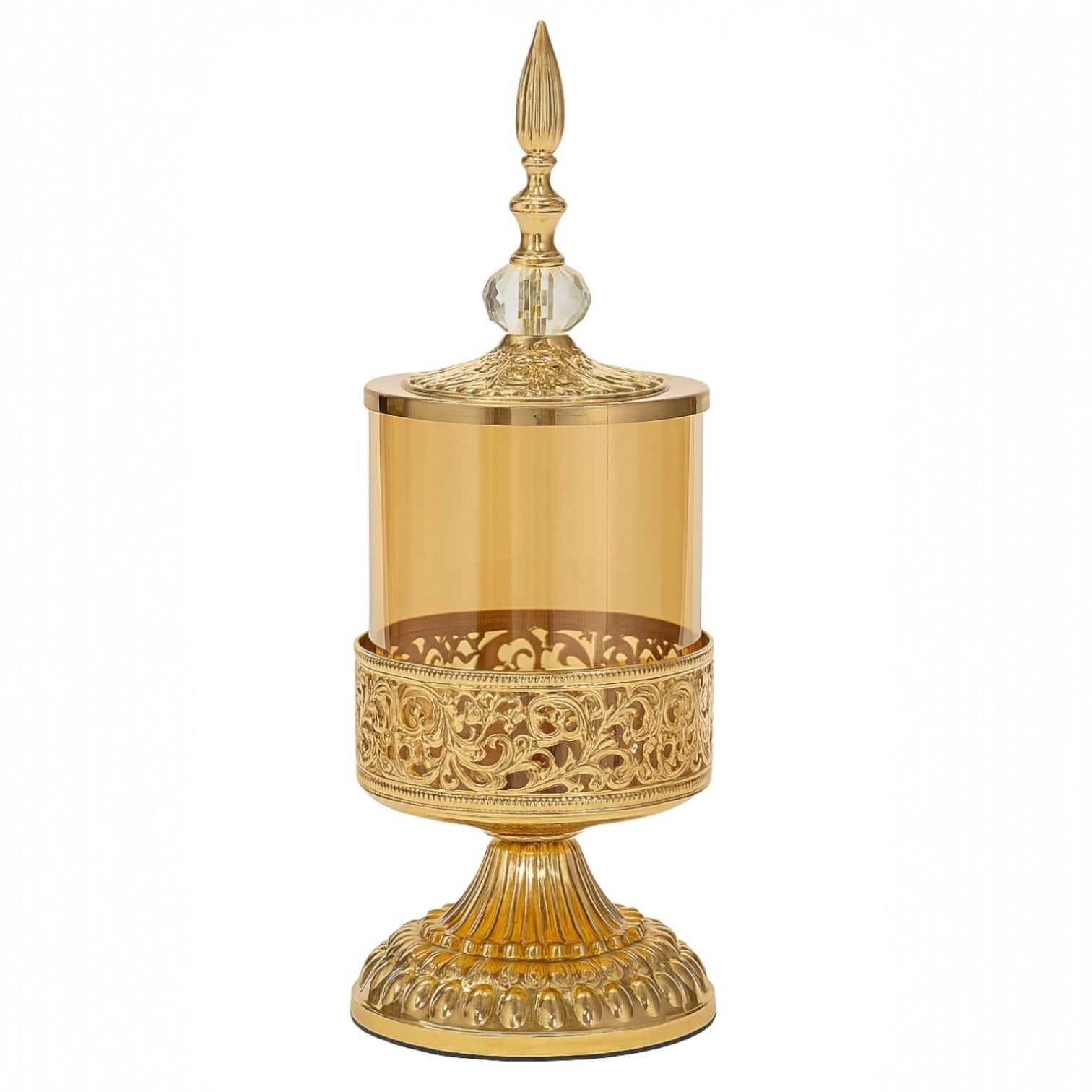 💫 Este copón decorativo de 35 cm es una auténtica joya para los amantes de la decoración clásica y elegante. Su estructura combina una base de metal dorado con relieves acanalados y detalles tallados que aportan sofisticación y carácter a cualquier rincón. El cuerpo central, fabricado en plástico duro de alta calidad con acabado translúcido ámbar, ofrece un aspecto lujoso similar al vidrio pero con mayor ligereza.
