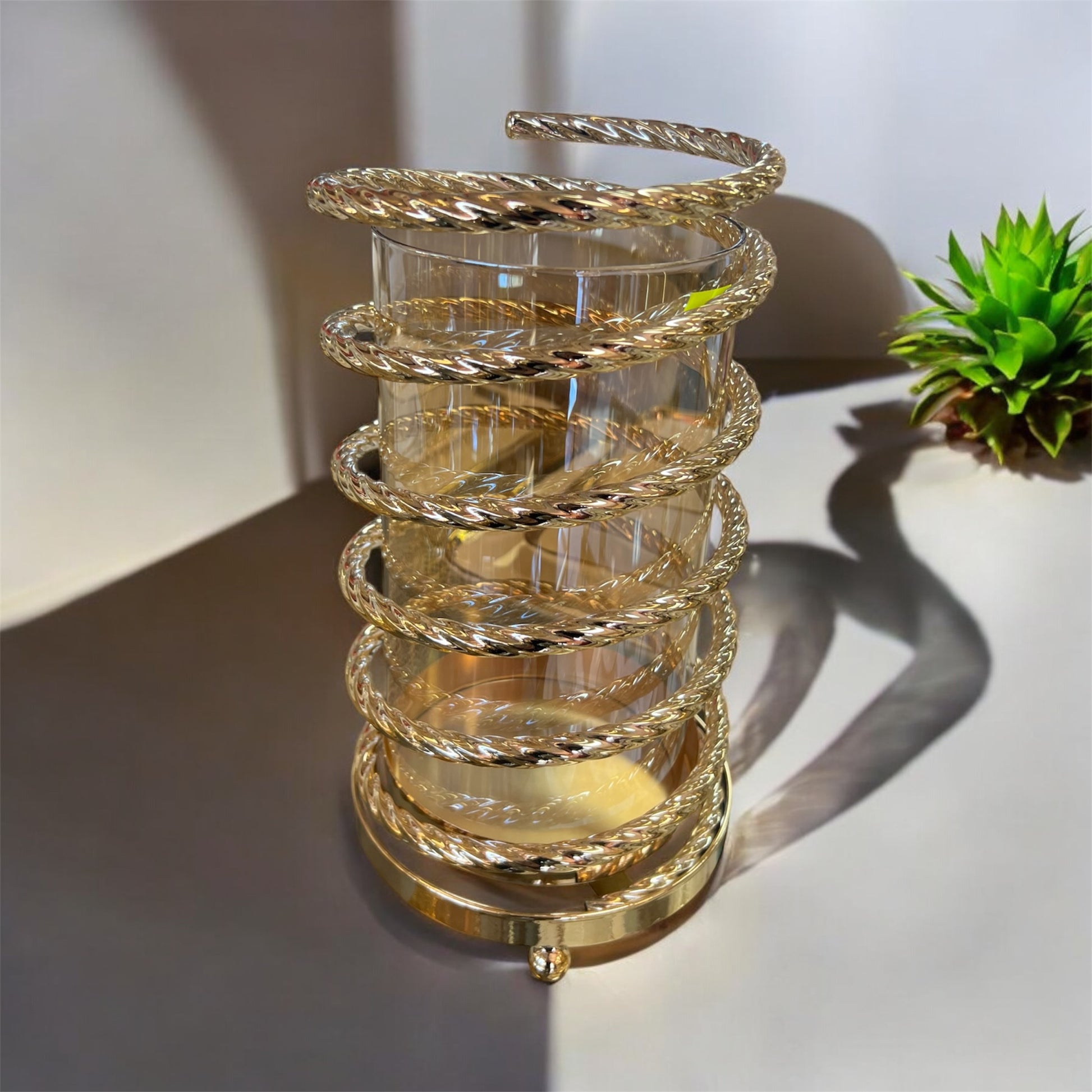 🌟 Ilumina tus espacios con estilo y elegancia gracias a este portavelas de cristal con estructura metálica dorada, diseñado con un sofisticado acabado en espiral que envuelve el vaso de cristal. Su brillo dorado y su diseño moderno aportan un toque de lujo y calidez a cualquier rincón de tu hogar.