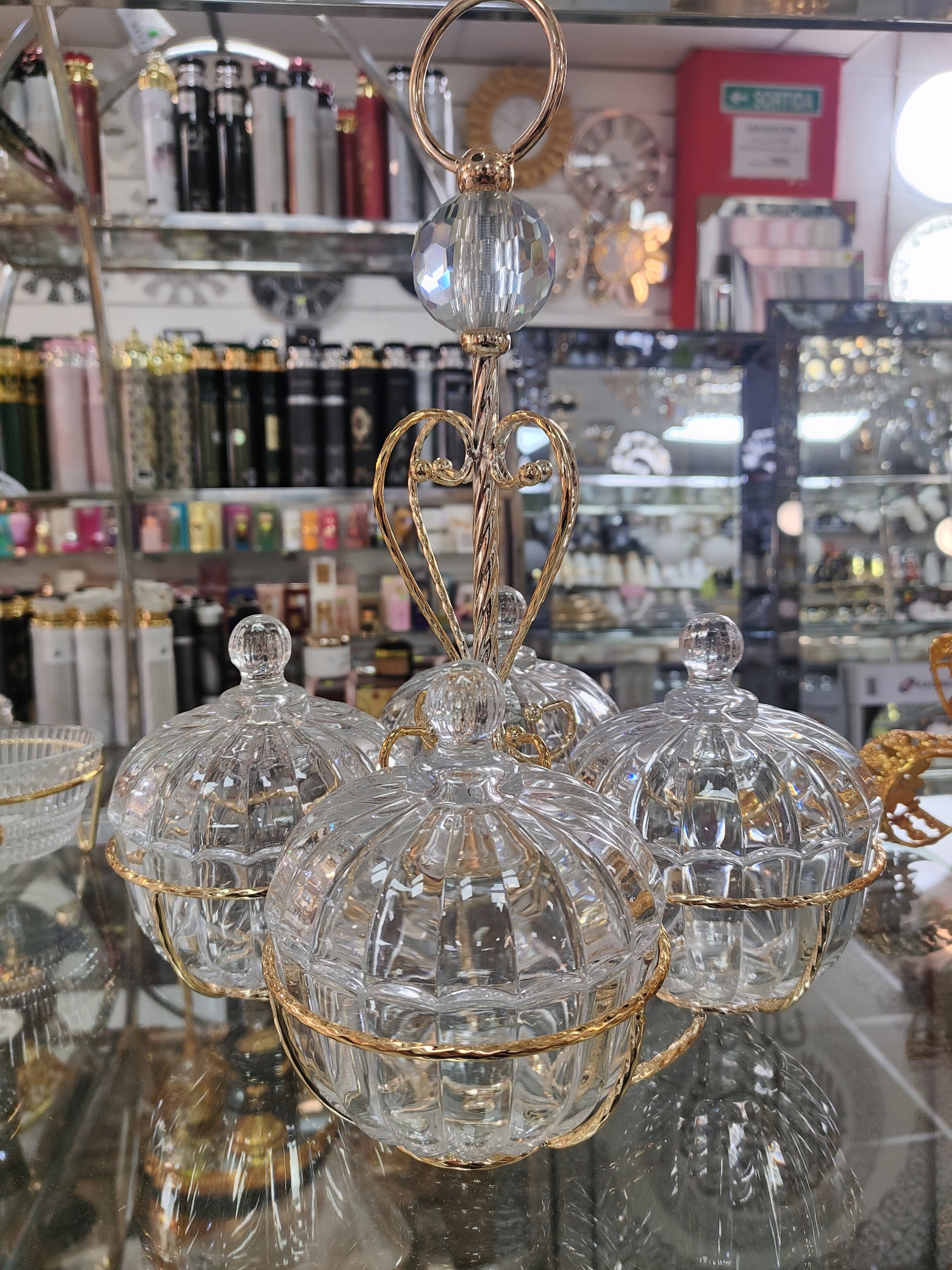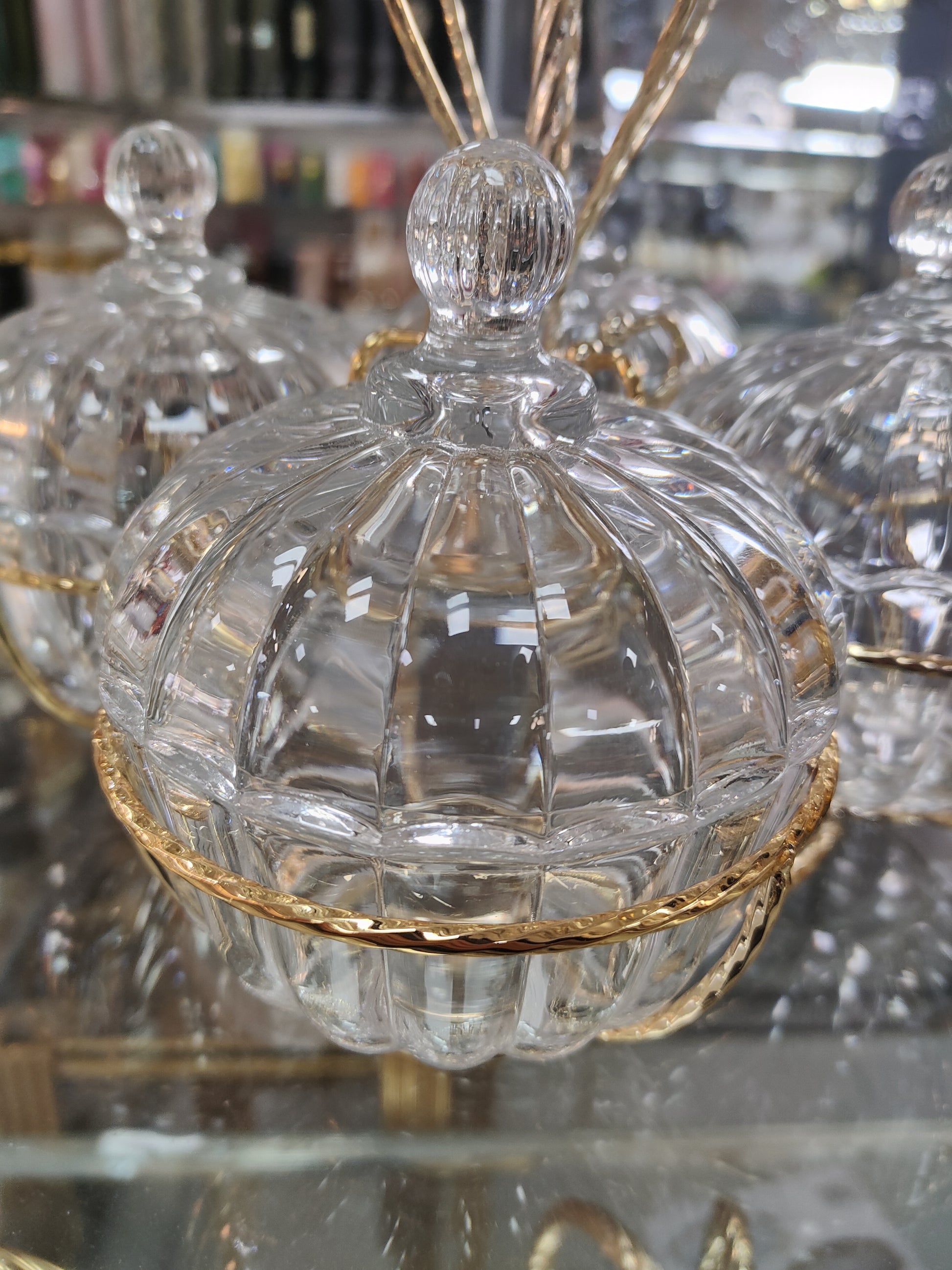 💎 Eleva la presentación de tus dulces, frutos secos o especias con este set de 3 dulceras de cristal tallado, sostenidas en un elegante soporte metálico dorado. Cada pieza cuenta con tapa y un diseño abombado que refleja la luz con un brillo espectacular, aportando un toque de lujo a cualquier mesa.