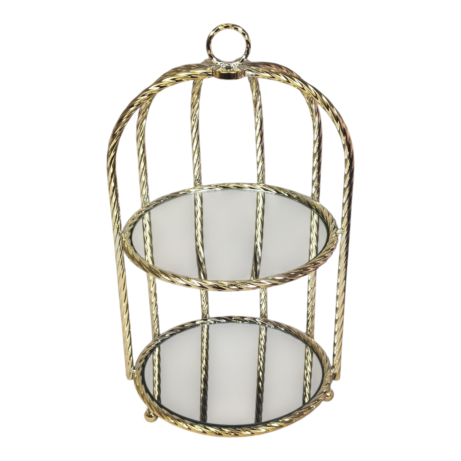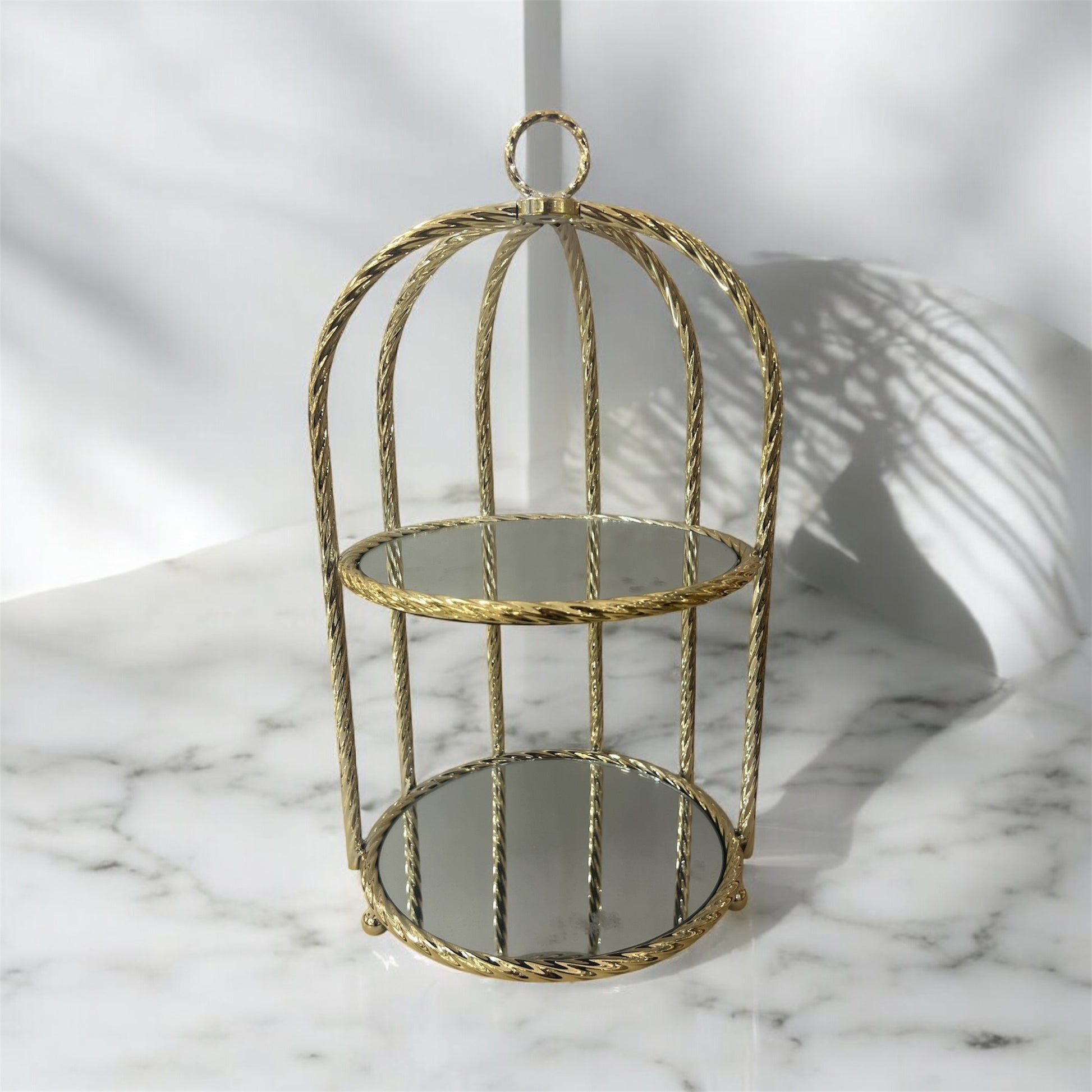 ✨ Añade glamour y sofisticación a tu hogar con este estante dorado de 2 niveles con base de espejo, inspirado en un elegante diseño en forma de jaula. Fabricado con metal trenzado en tono dorado brillante, combina lujo, ligereza y modernidad en una sola pieza.