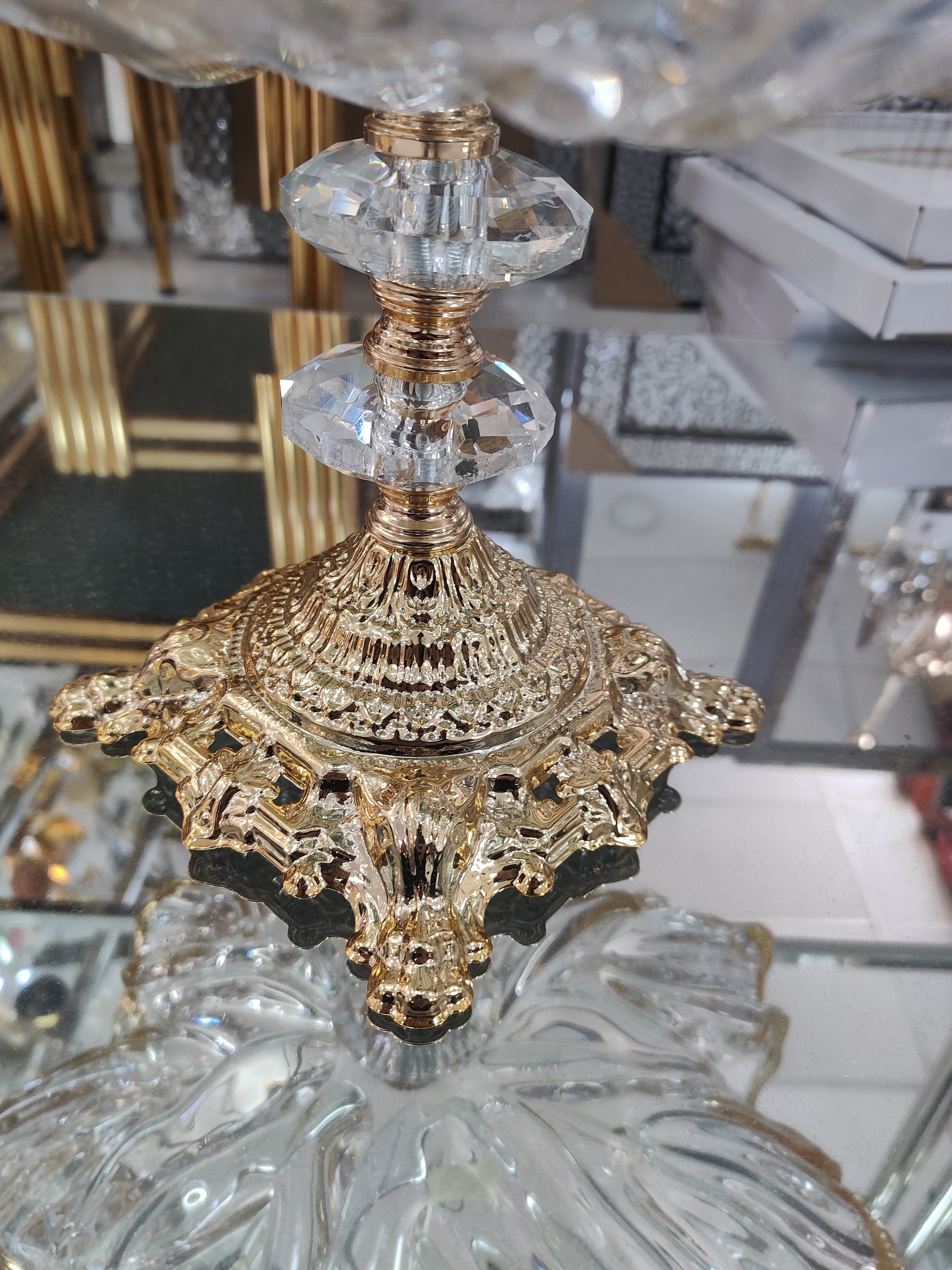 ✨ Impresiona a tus invitados con este frutero de cristal tallado con base dorada, una pieza que combina el arte clásico con un toque moderno de lujo. Su borde ondulado con detalles dorados resalta la pureza del cristal y aporta un brillo espectacular bajo cualquier luz.