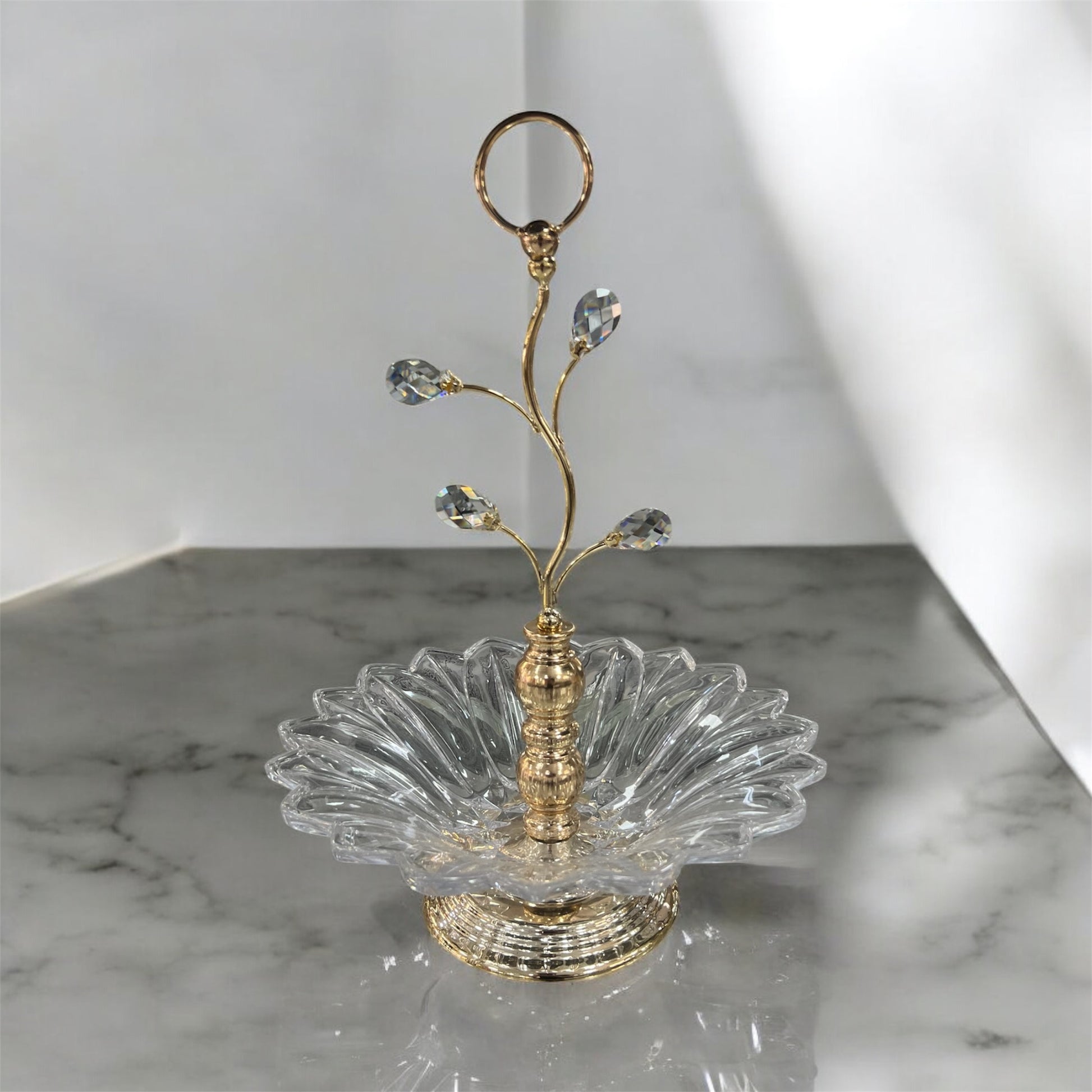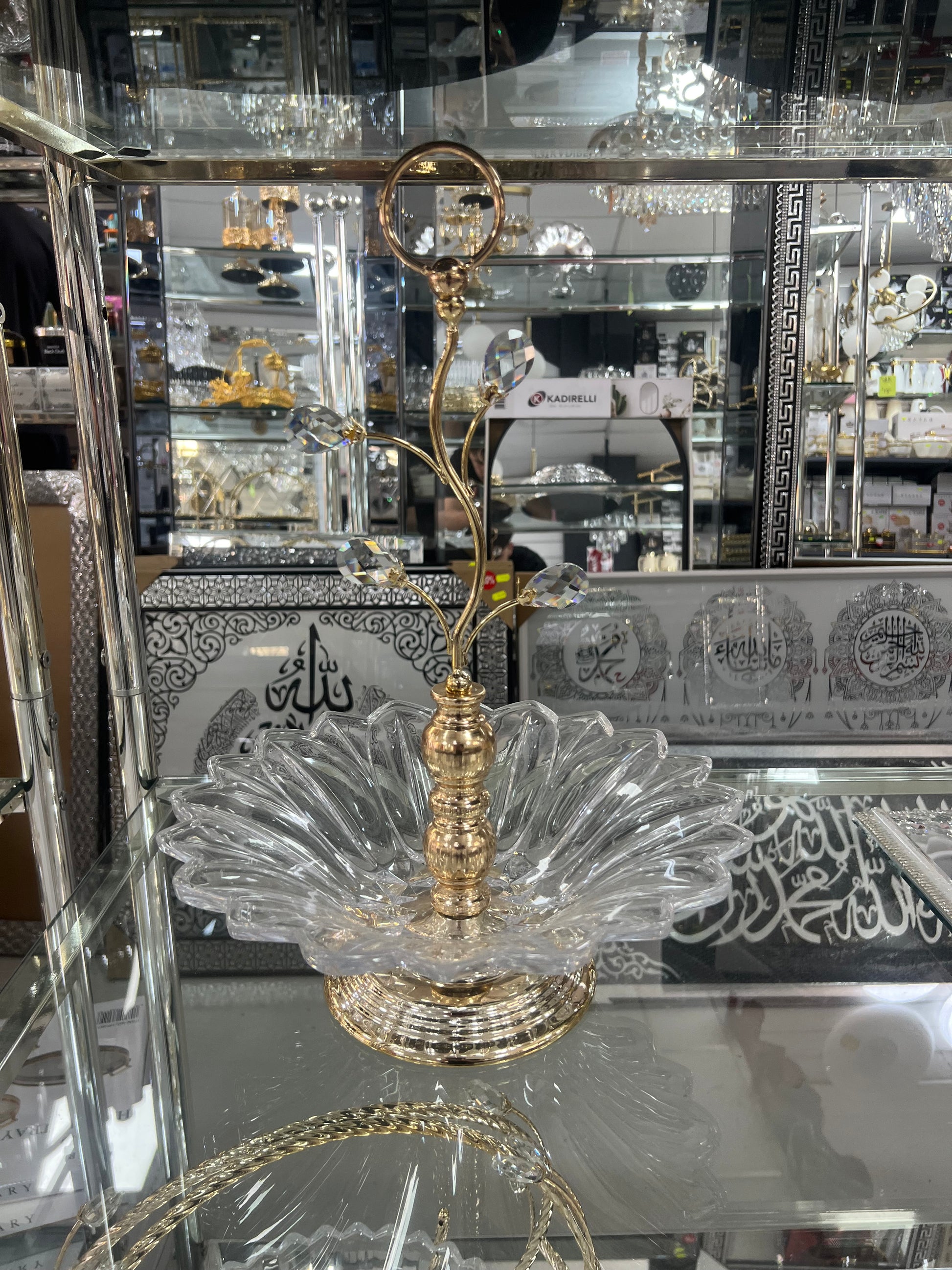 • El plato grande en forma de flor está hecho de cristal grueso y tallado.