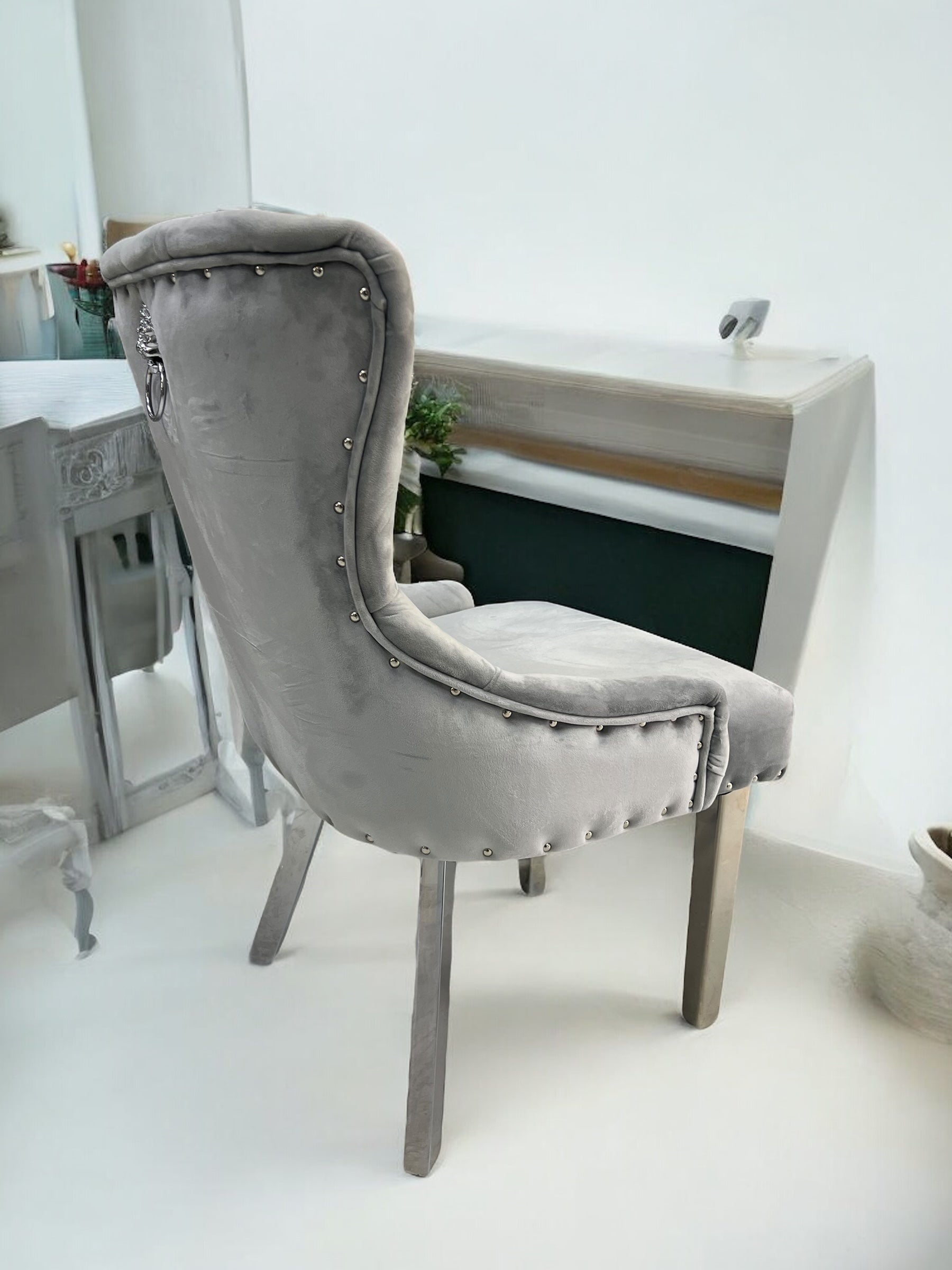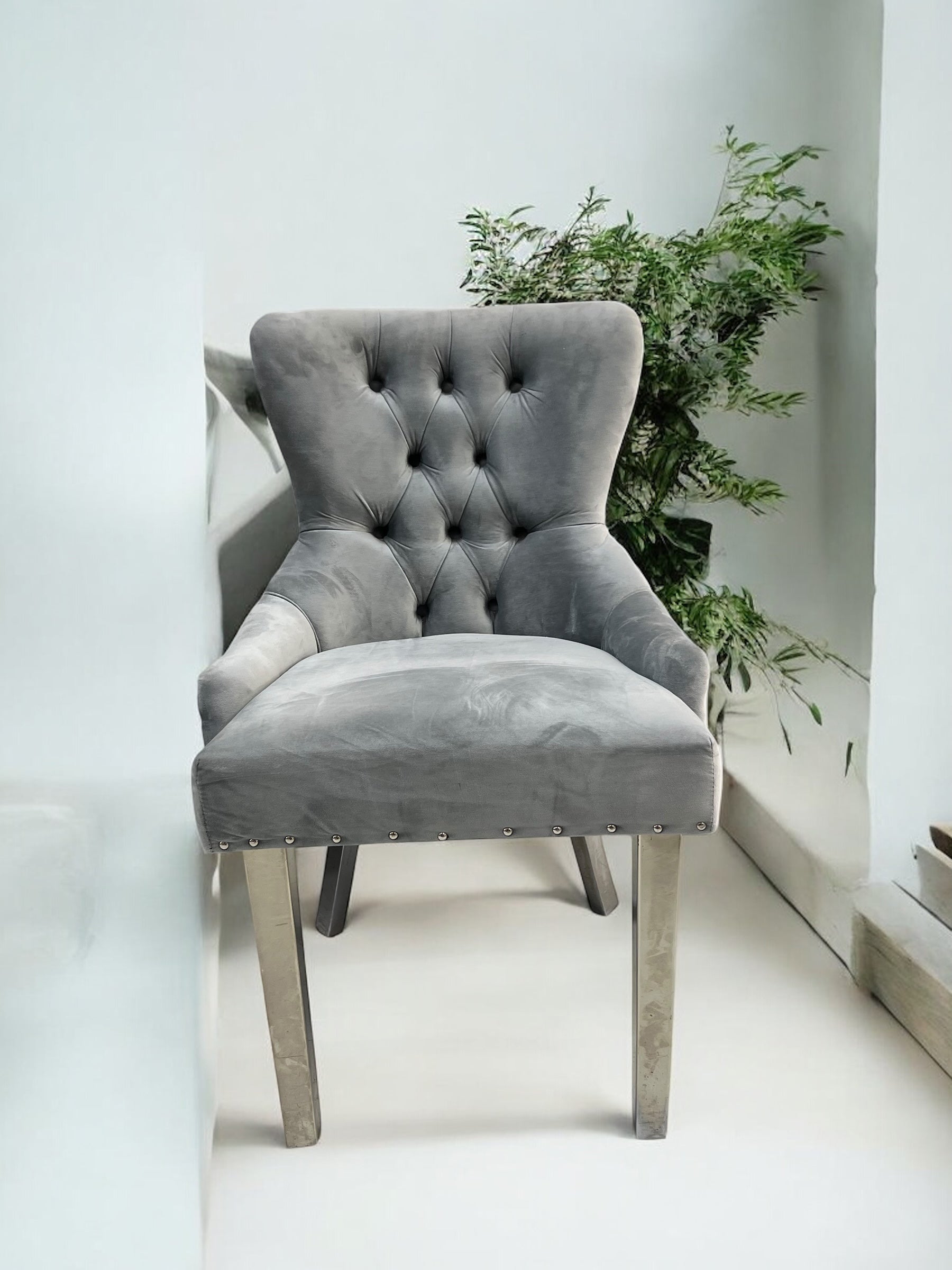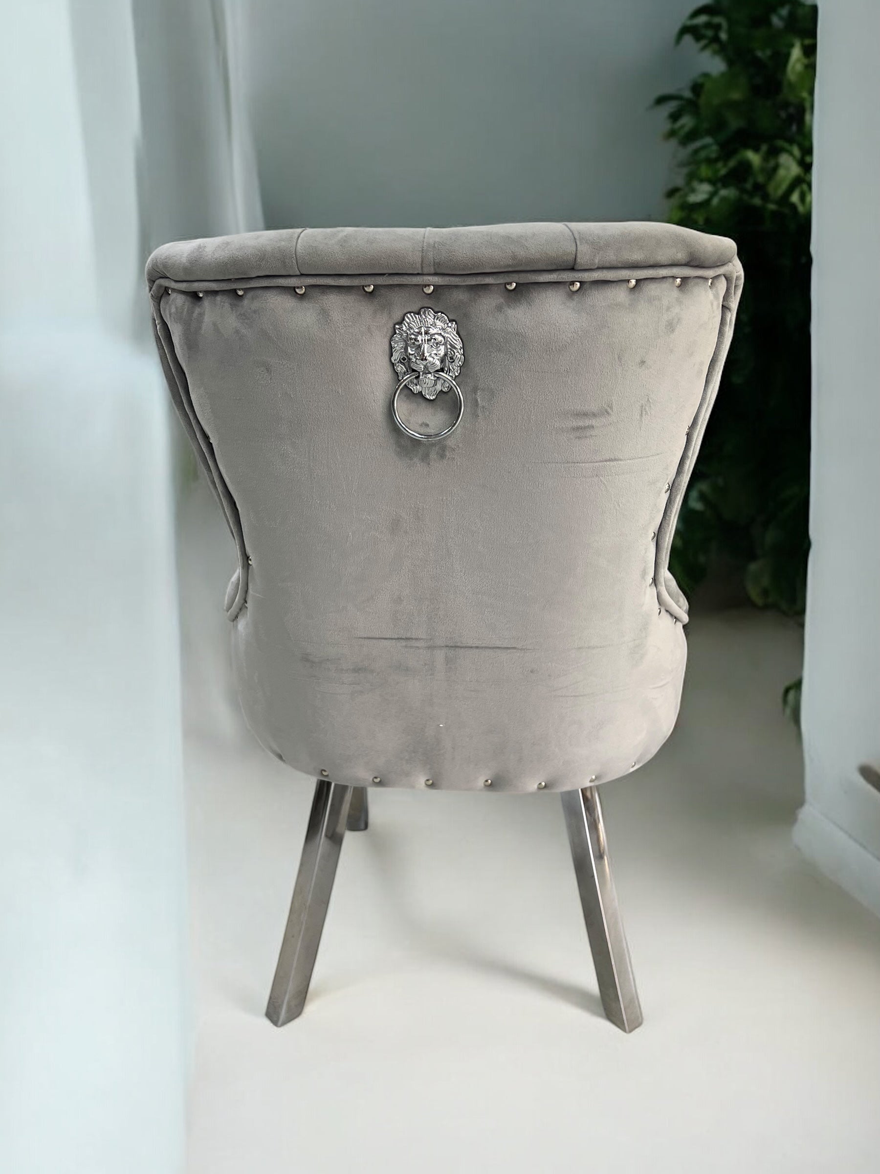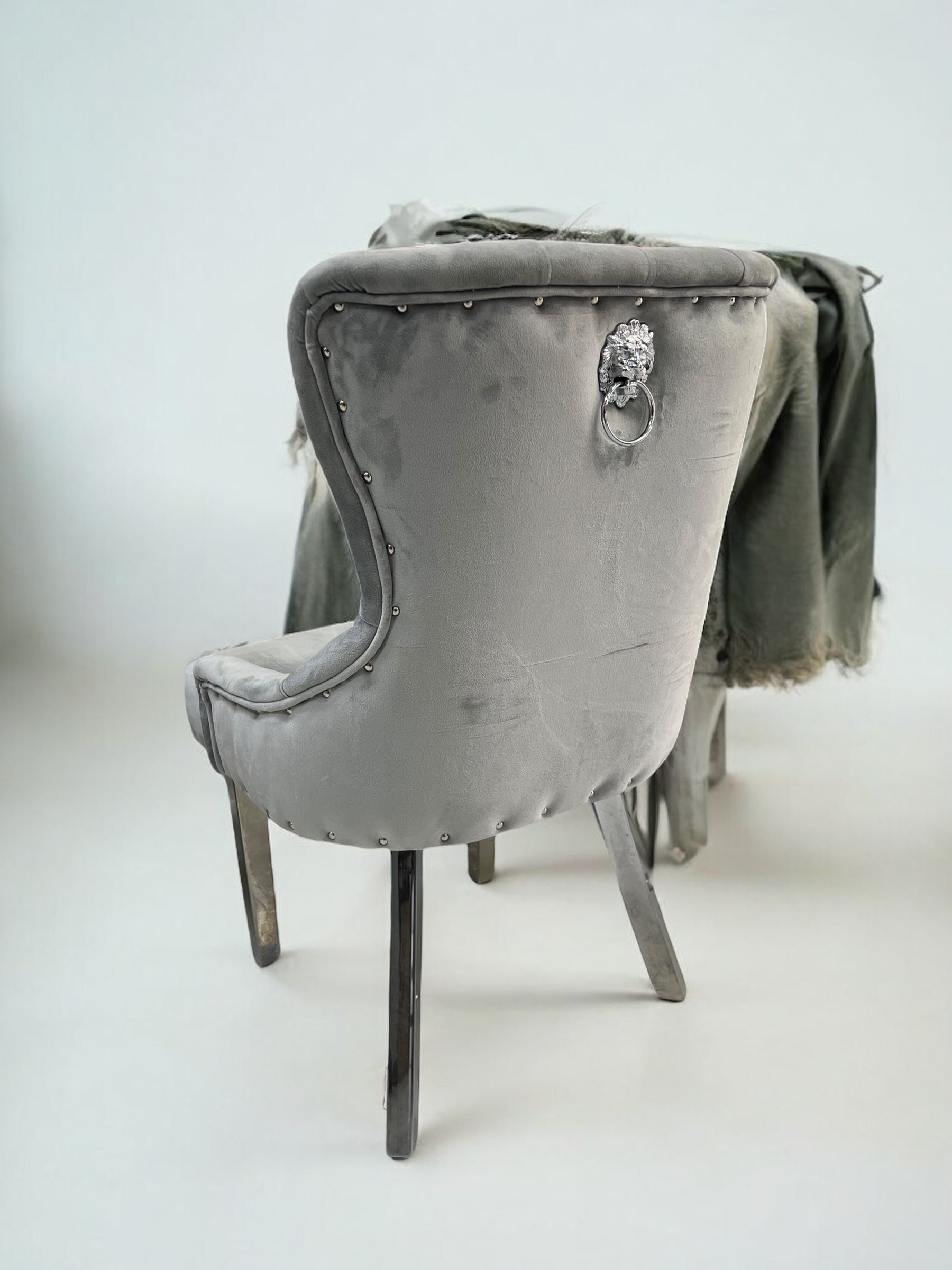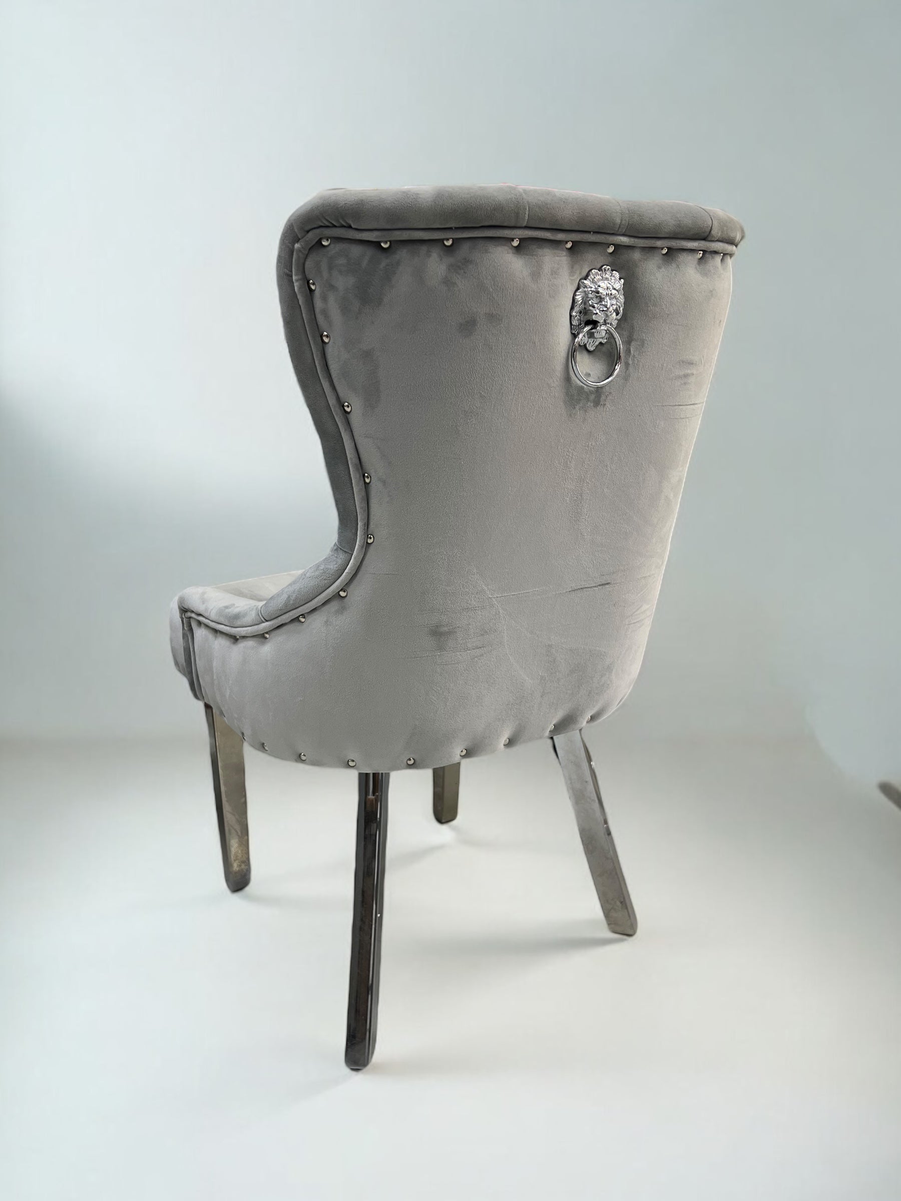 Cadeira de jantar LONDRAV25 em veludo de leão cinza, pernas de metal cinza