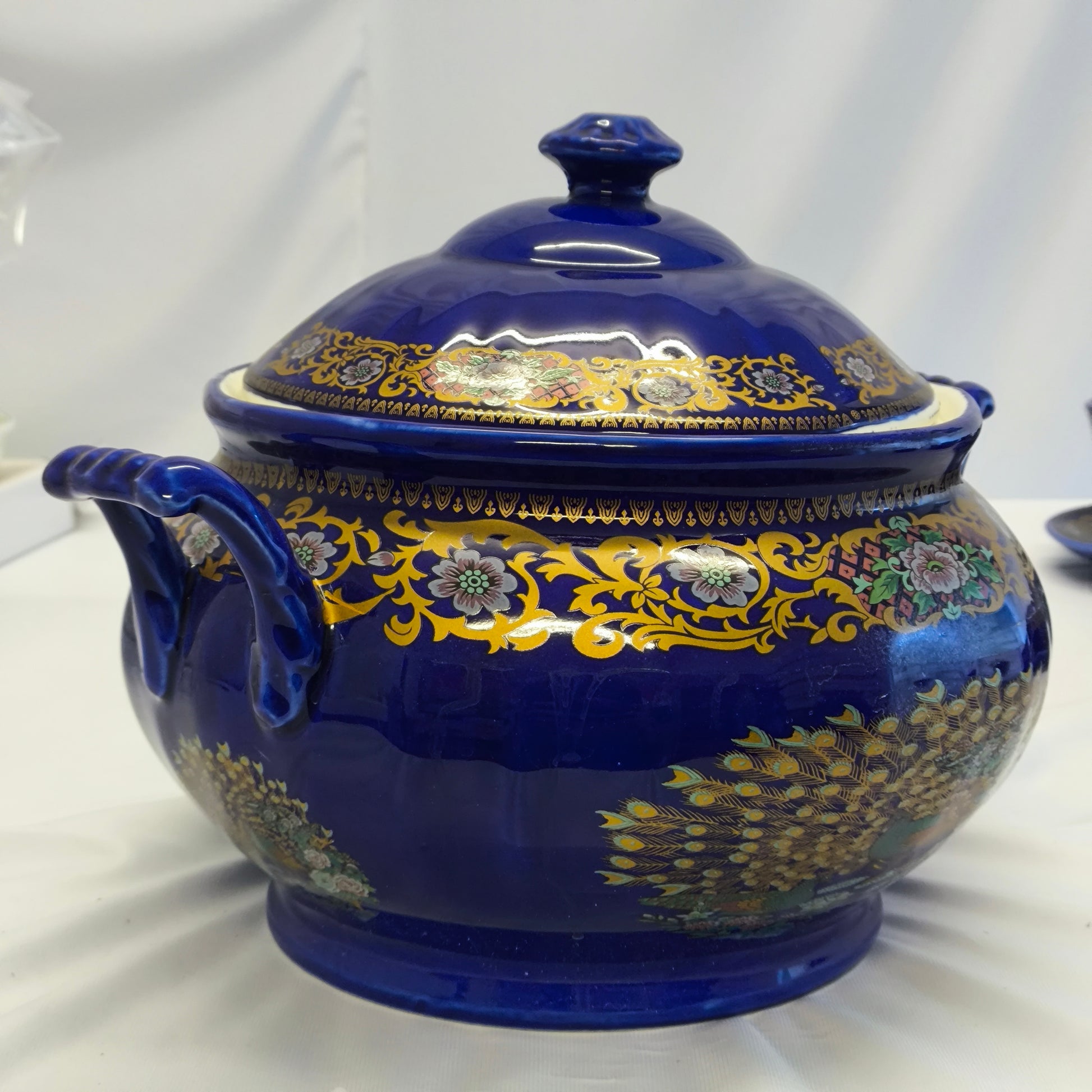 Luce tu mesa como nunca con este elegante juego de sopera en tono azul real, decorado con delicados pavos reales dorados y motivos florales. Perfecto para servir sopas, caldos, consomés o guisos en reuniones familiares y cenas especiales.