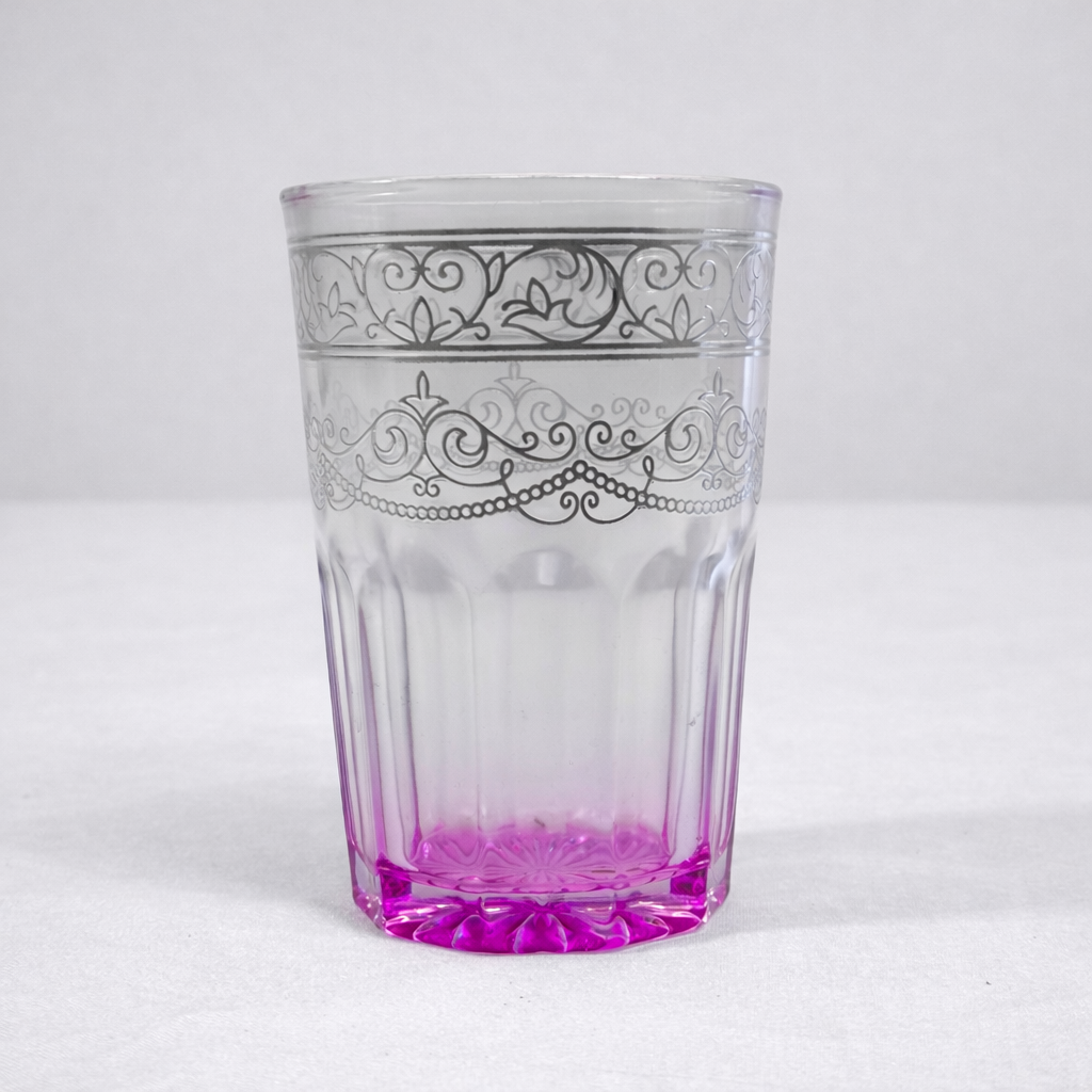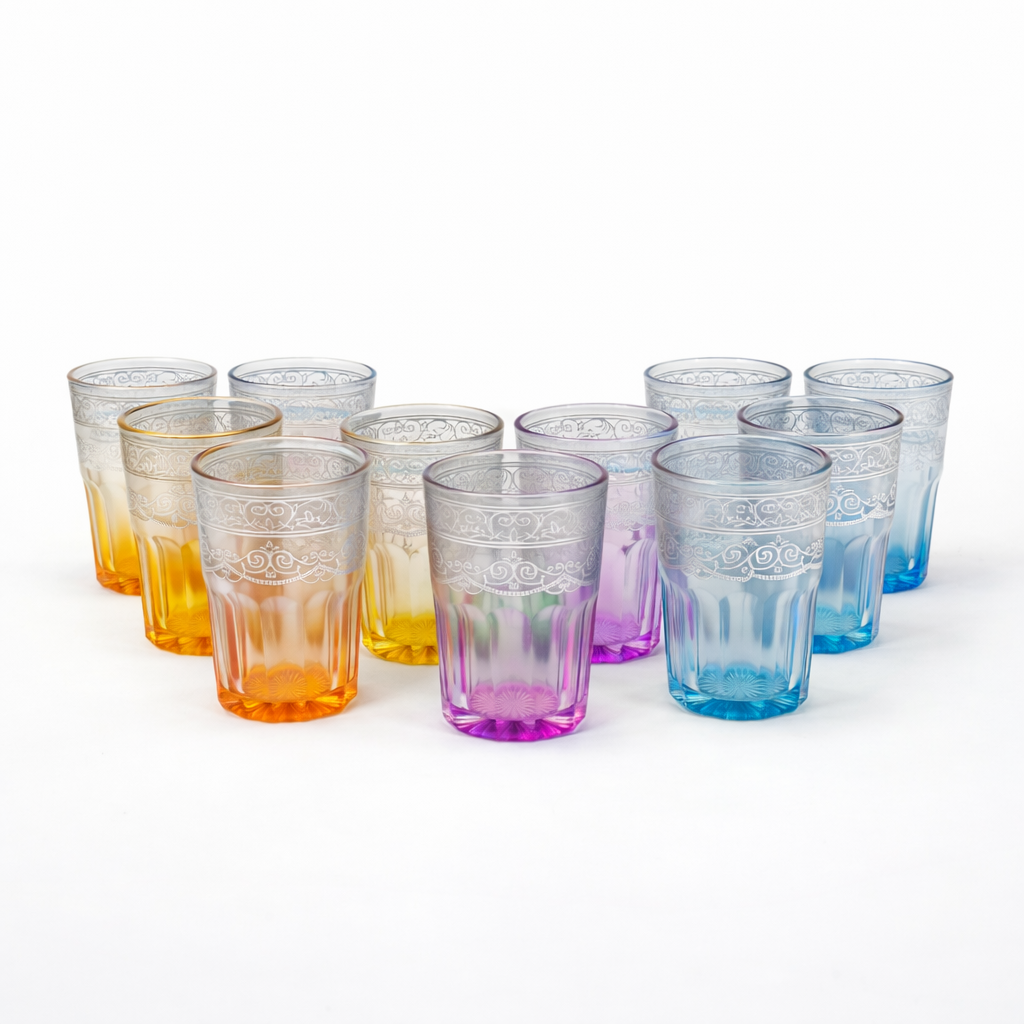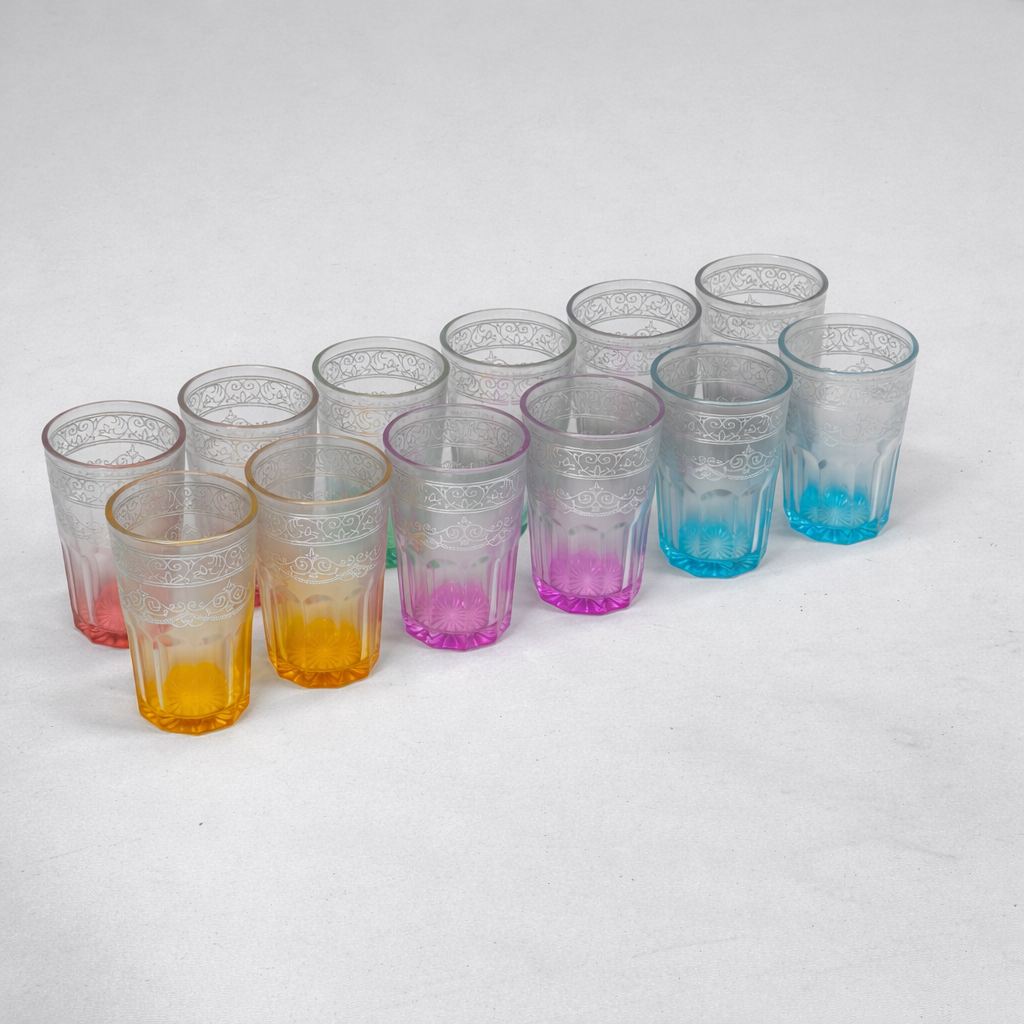 Adicione um toque de elegância e cor à sua mesa com este bonito conjunto de 12 copos decorativos em vidro. Cada copo apresenta um delicado desenho floral em relevo e um acabamento em degradé na base, disponível em âmbar, rosa, verde e azul.