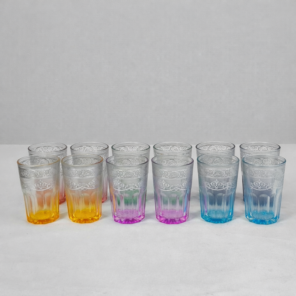 Conjunto de 12 copos em vidro com cores degradé e estampado floral.